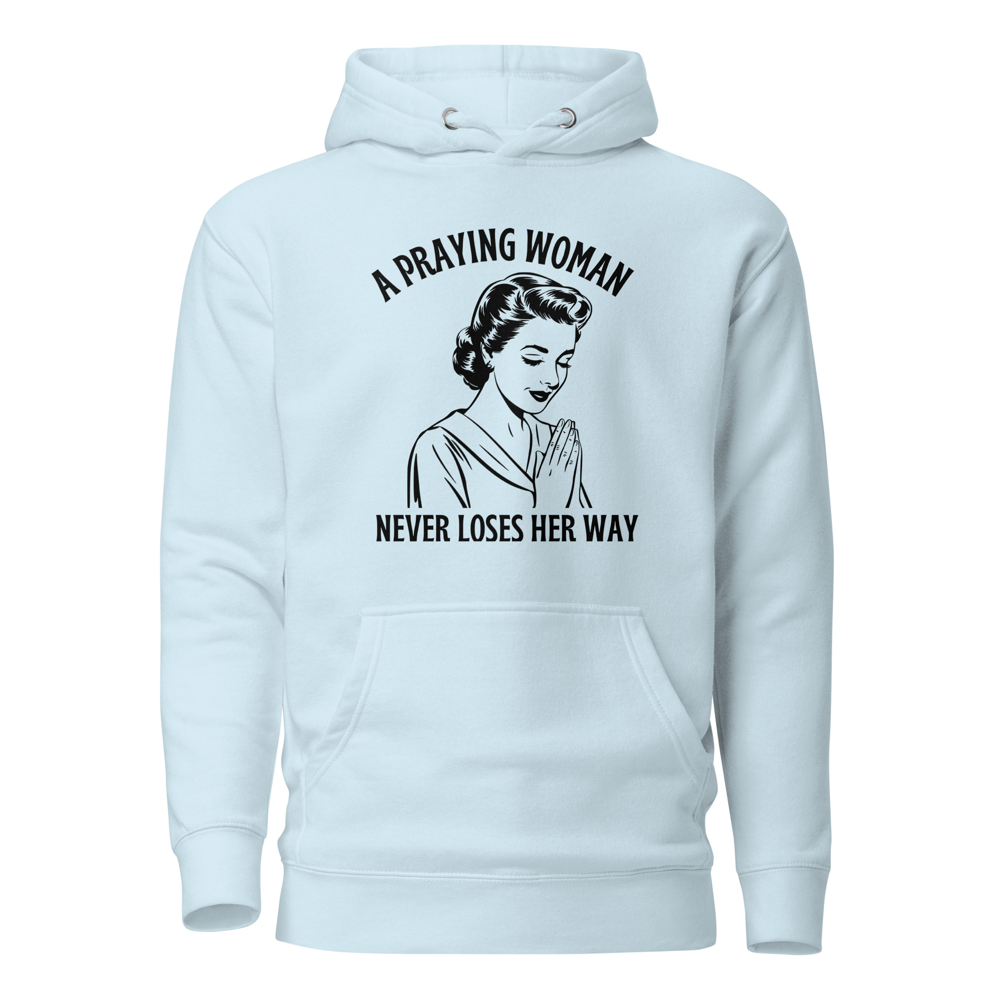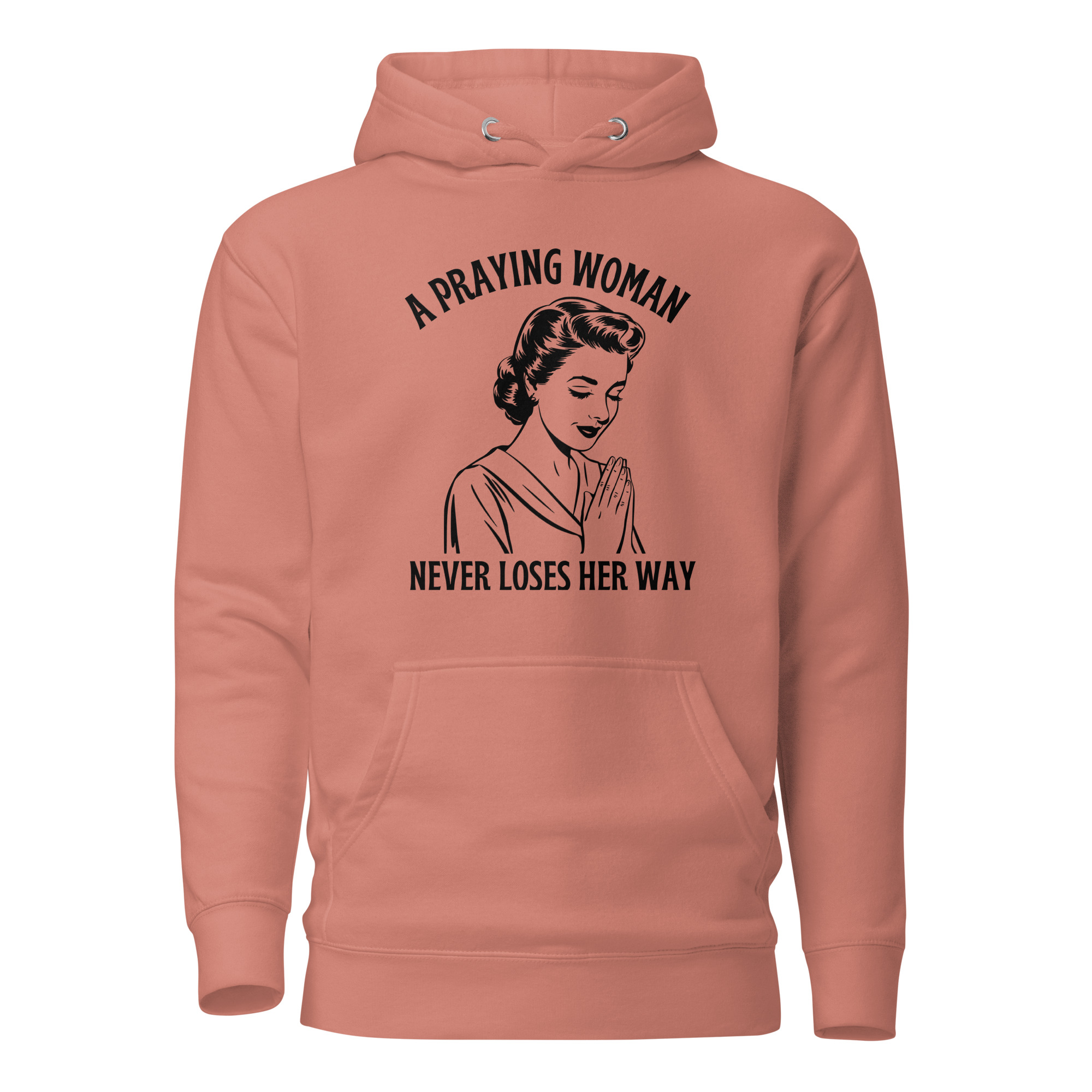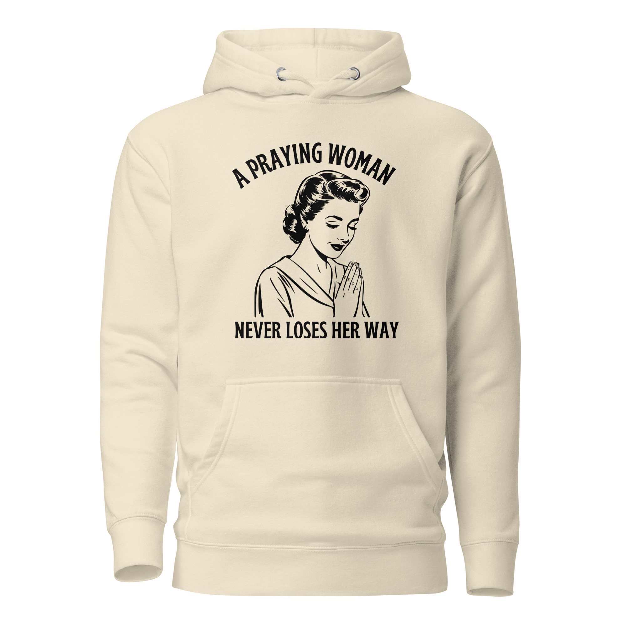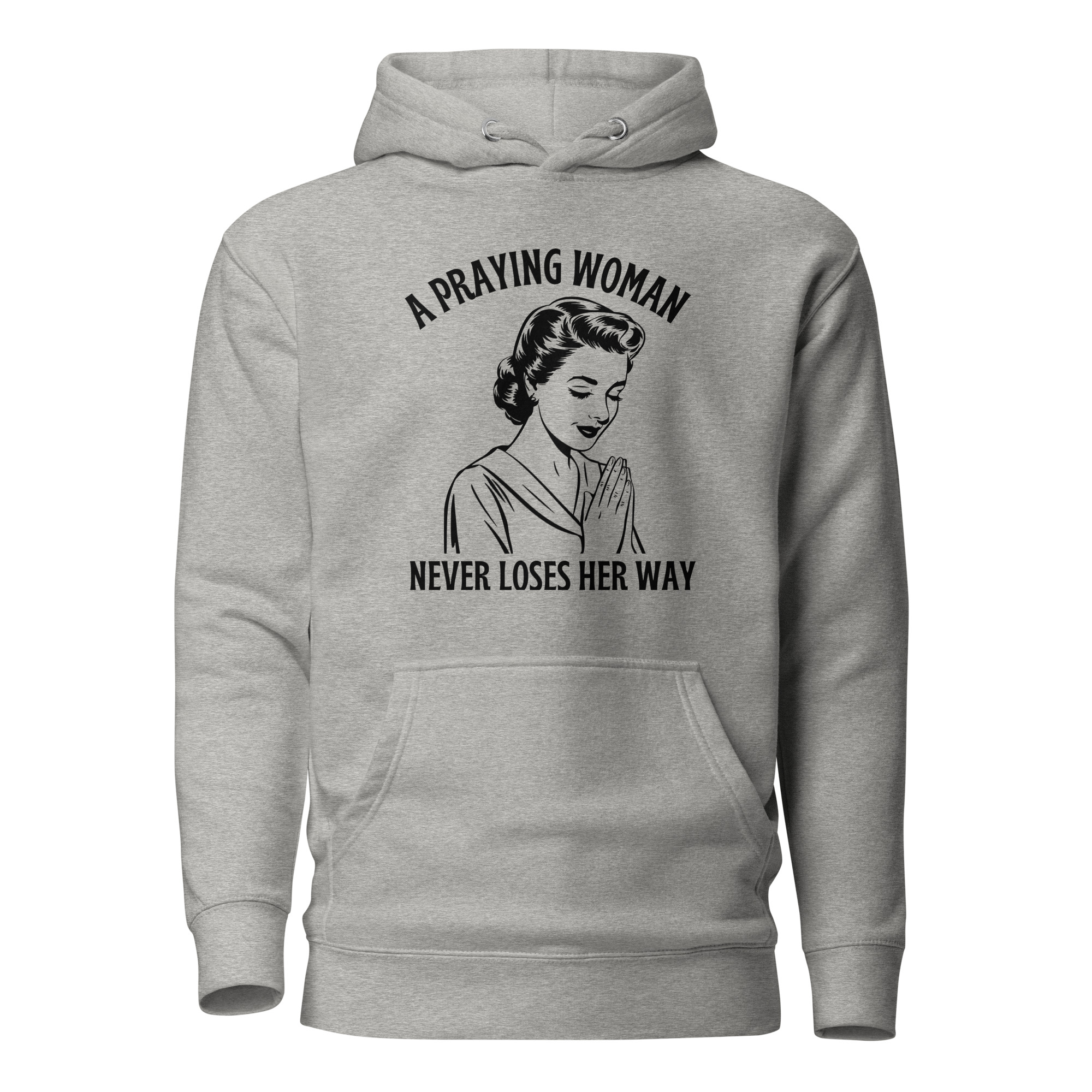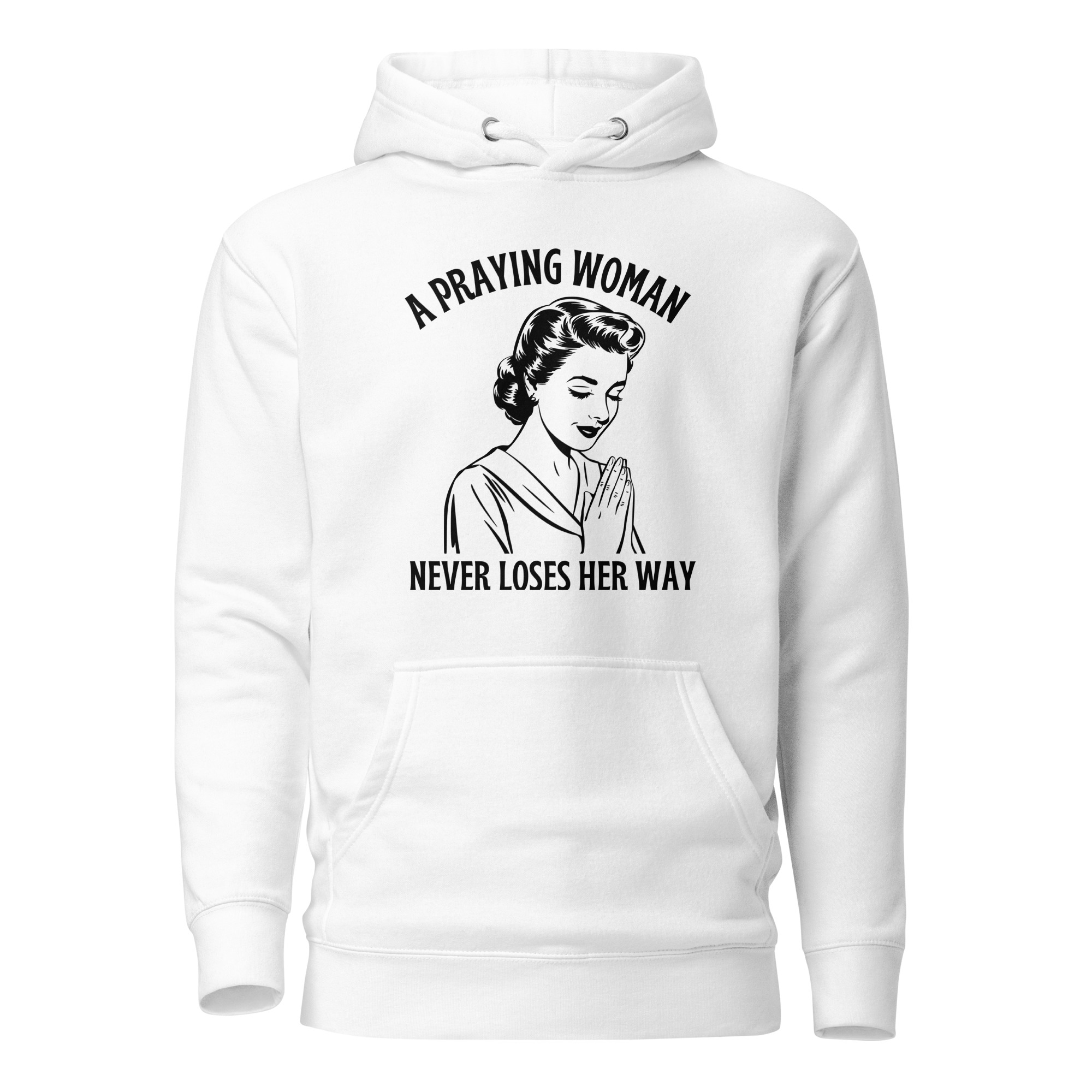 Embrace your faith with this premium Cotton Heritage Christian hoodie featuring the inspiring message “A Praying Woman Never Loses Her Way”. Designed in a unique vintage style, the illustration of a praying woman serves as a daily reminder of strength, devotion, and guidance through prayer. Crafted with soft cotton for comfort and durability, this hoodie is perfect for church gatherings, Bible study, or casual everyday wear. A timeless piece of Christian apparel that blends fashion with spiritual encouragement.