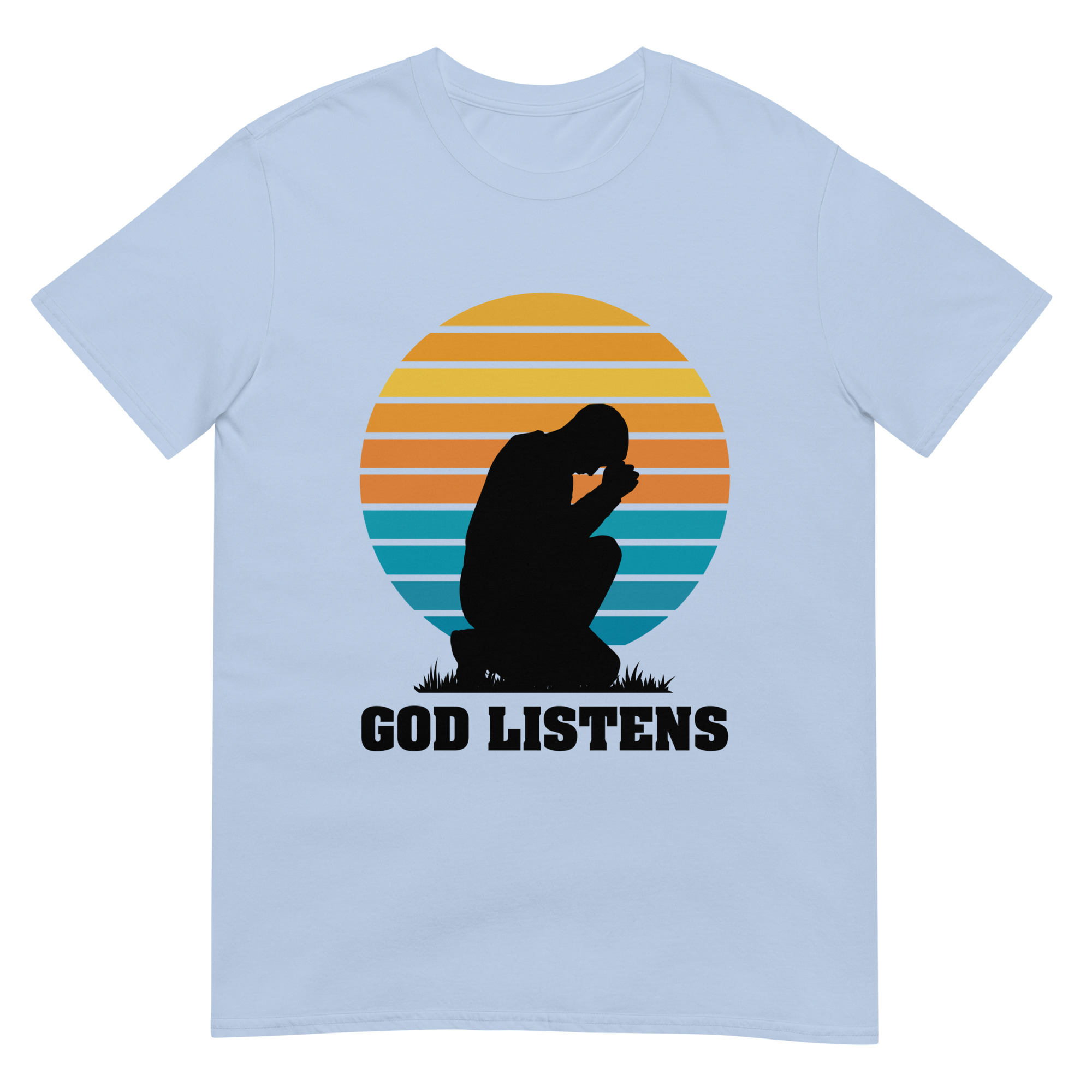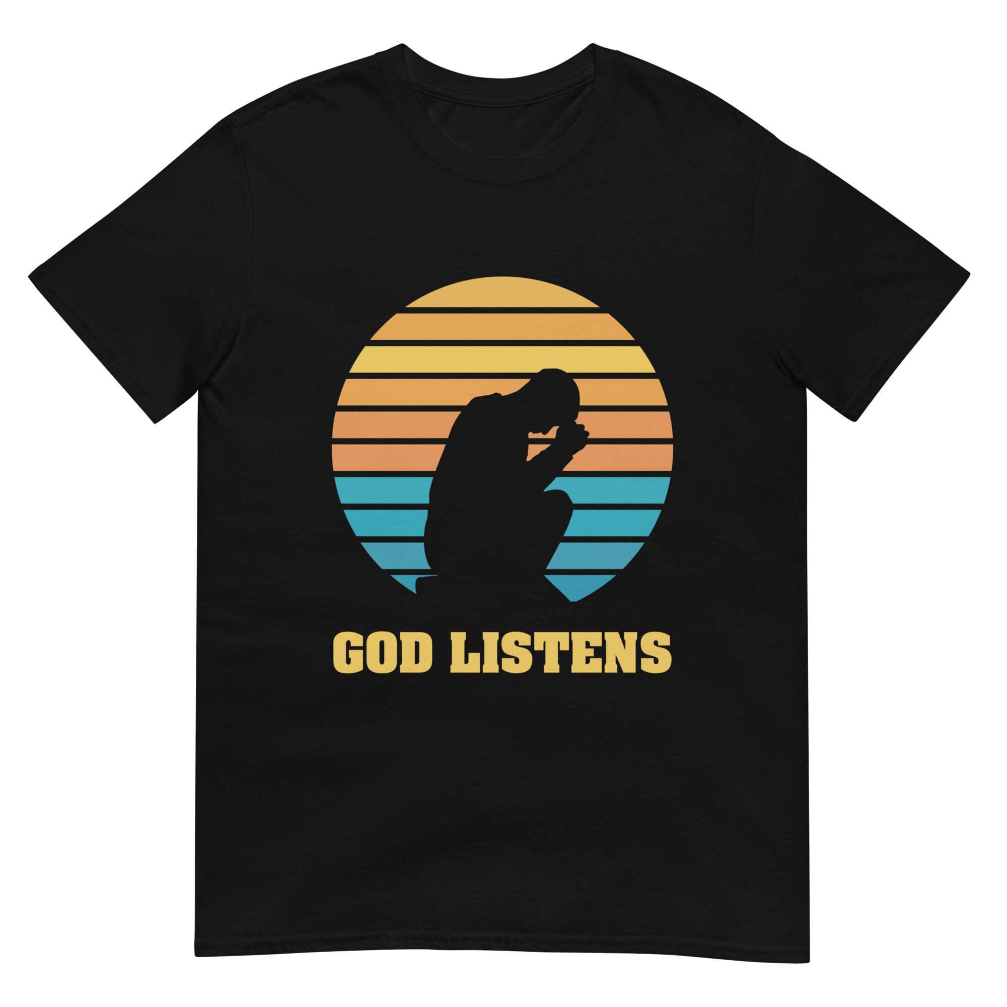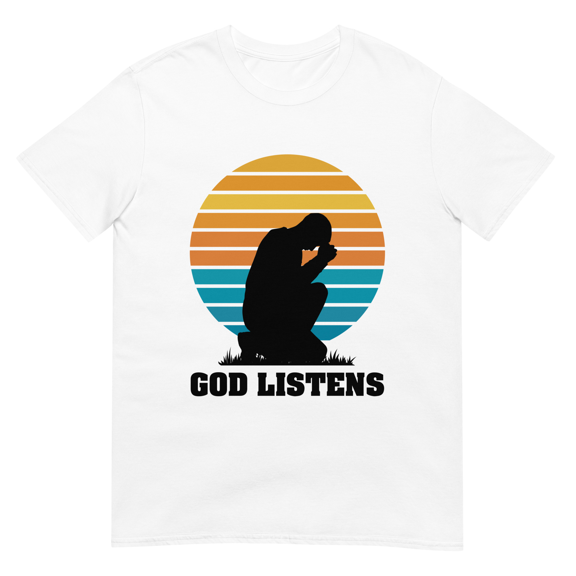 Wear your faith proudly with our “God Listens” t-shirt, featuring a minimalist silhouette of a praying man. This Gildan 64000 shirt offers soft, all-day comfort while reminding you—and those around you—that God hears every prayer. A perfect choice for church gatherings, prayer groups, or quiet personal devotion.