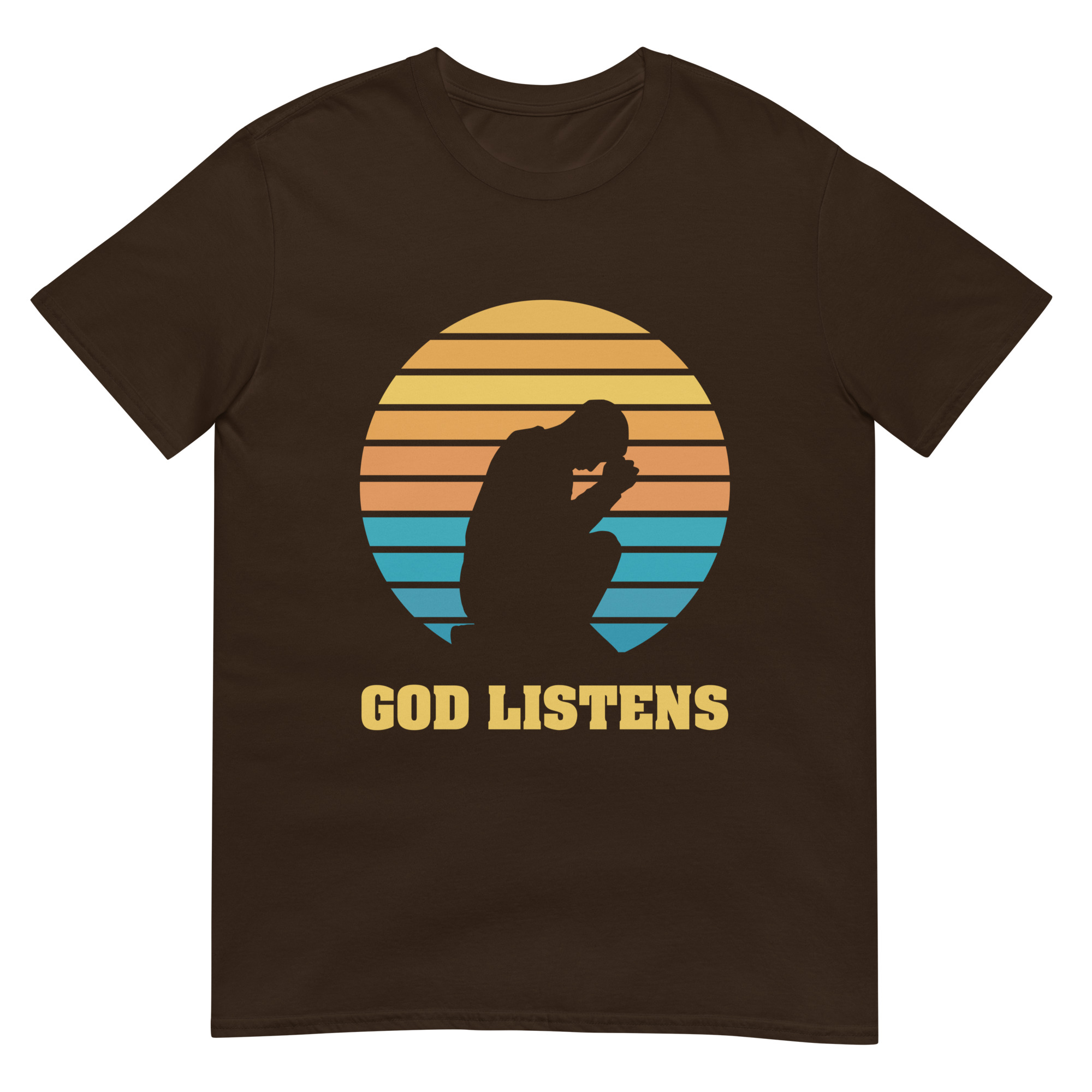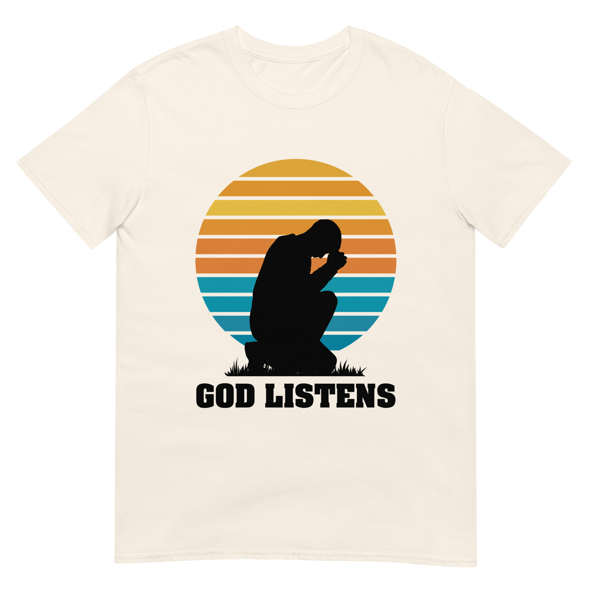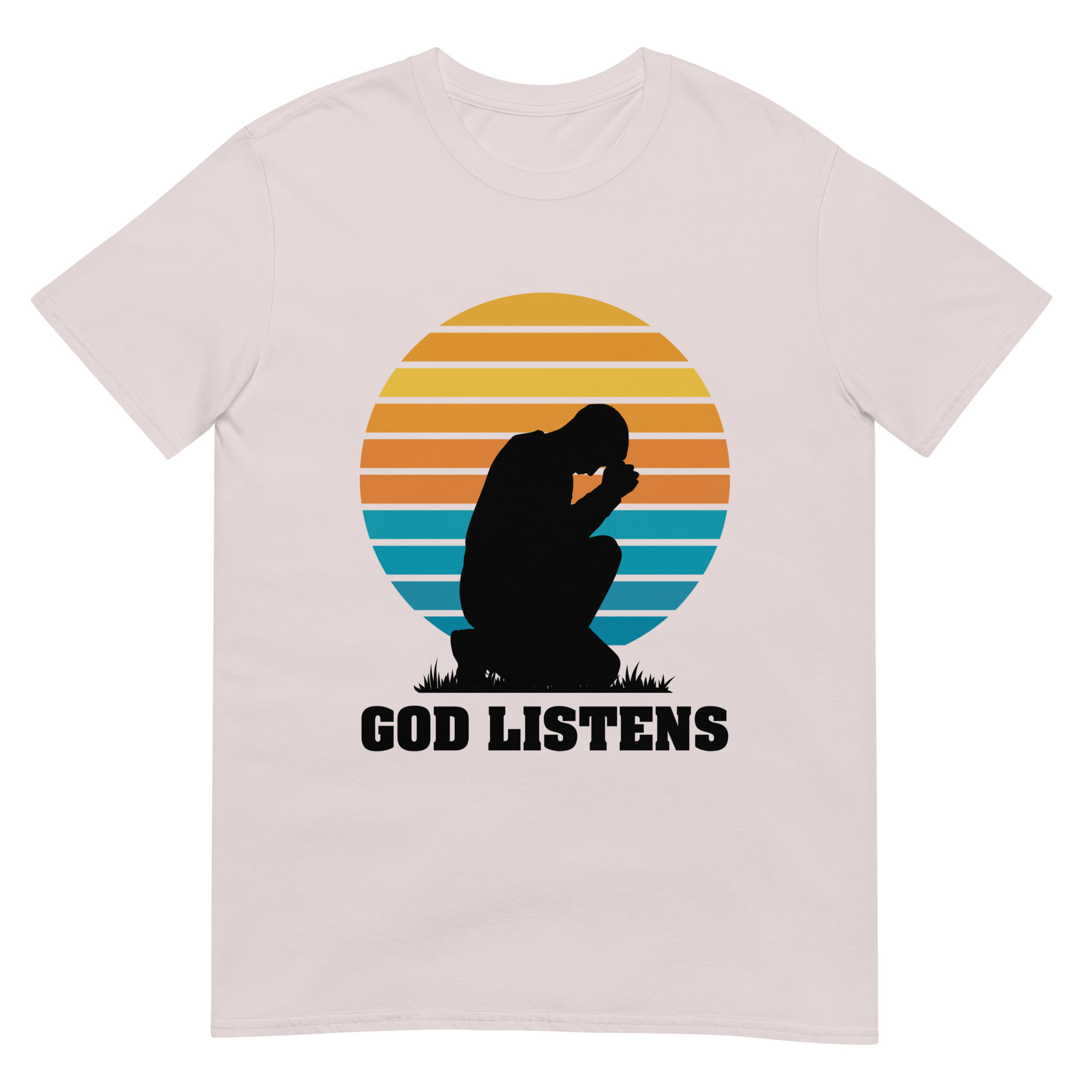 Wear your faith proudly with our “God Listens” t-shirt, featuring a minimalist silhouette of a praying man. This Gildan 64000 shirt offers soft, all-day comfort while reminding you—and those around you—that God hears every prayer. A perfect choice for church gatherings, prayer groups, or quiet personal devotion.
