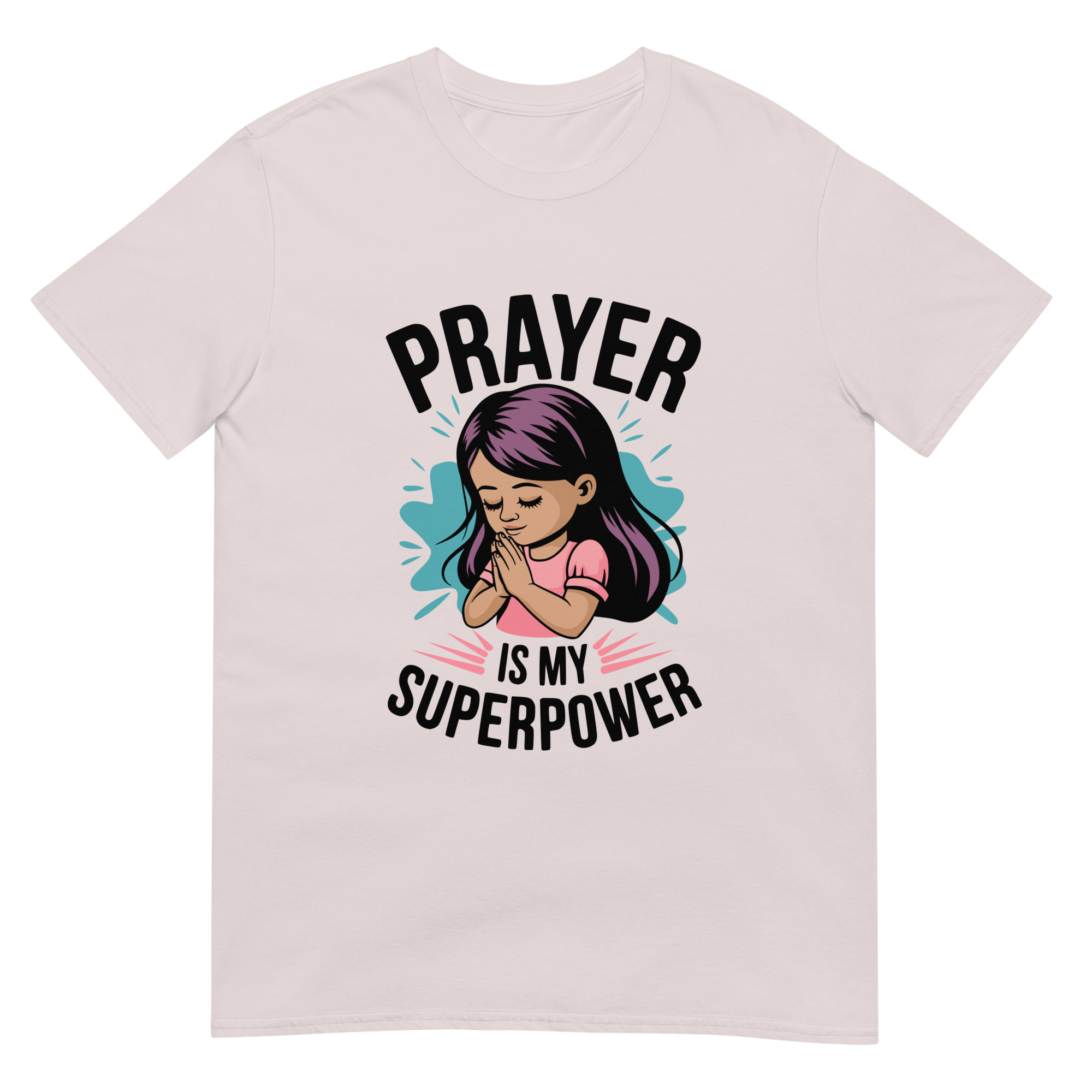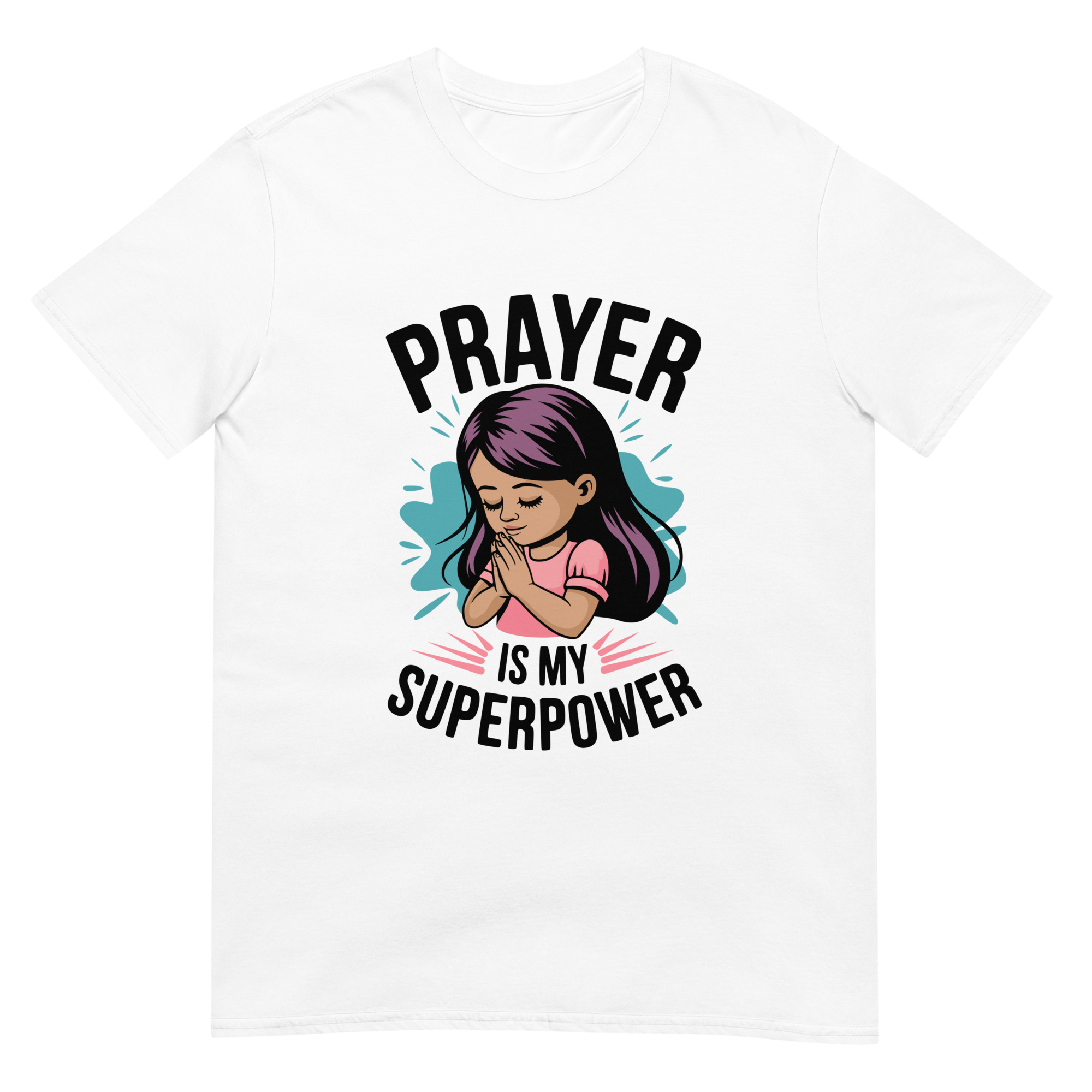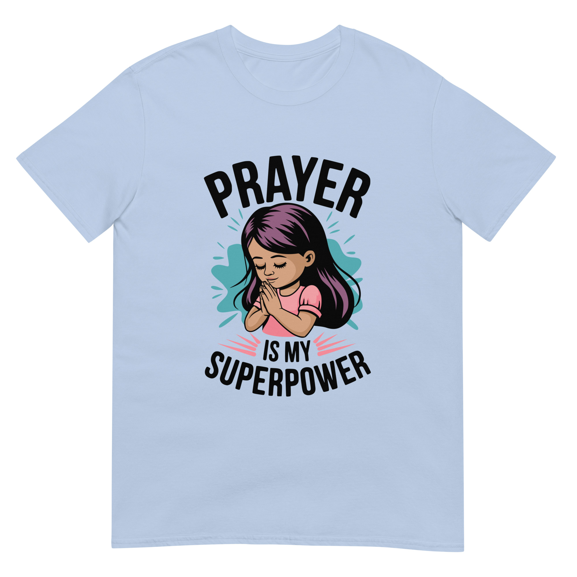 Prayer is My Superpower – Cute Christian Illustration on Tee. This adorable cartoon design reminds little ones that faith is their true superpower. Prayer isn’t just powerful—it’s a superpower for all God’s children. Prayer is my superpower, spiritual strength in prayer.