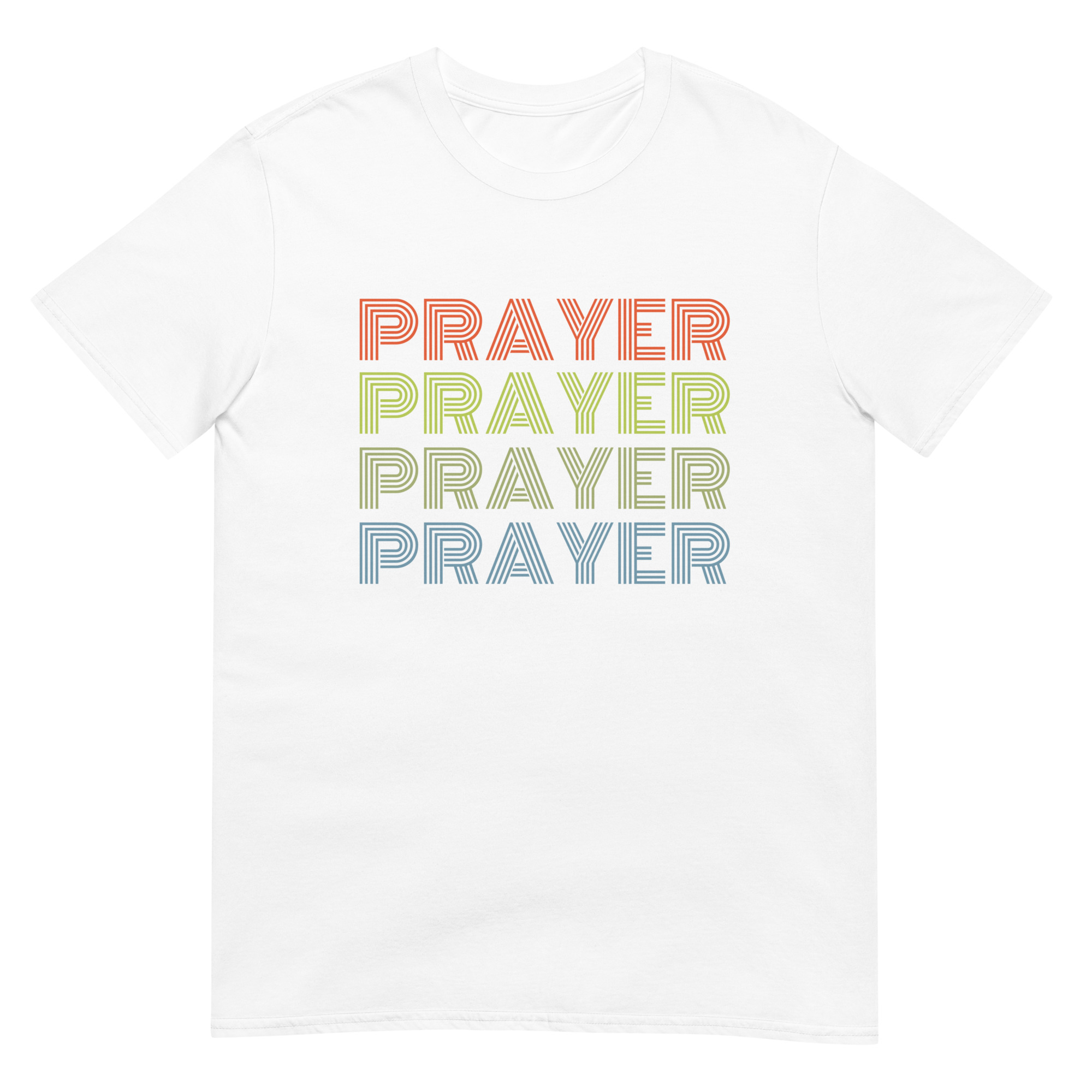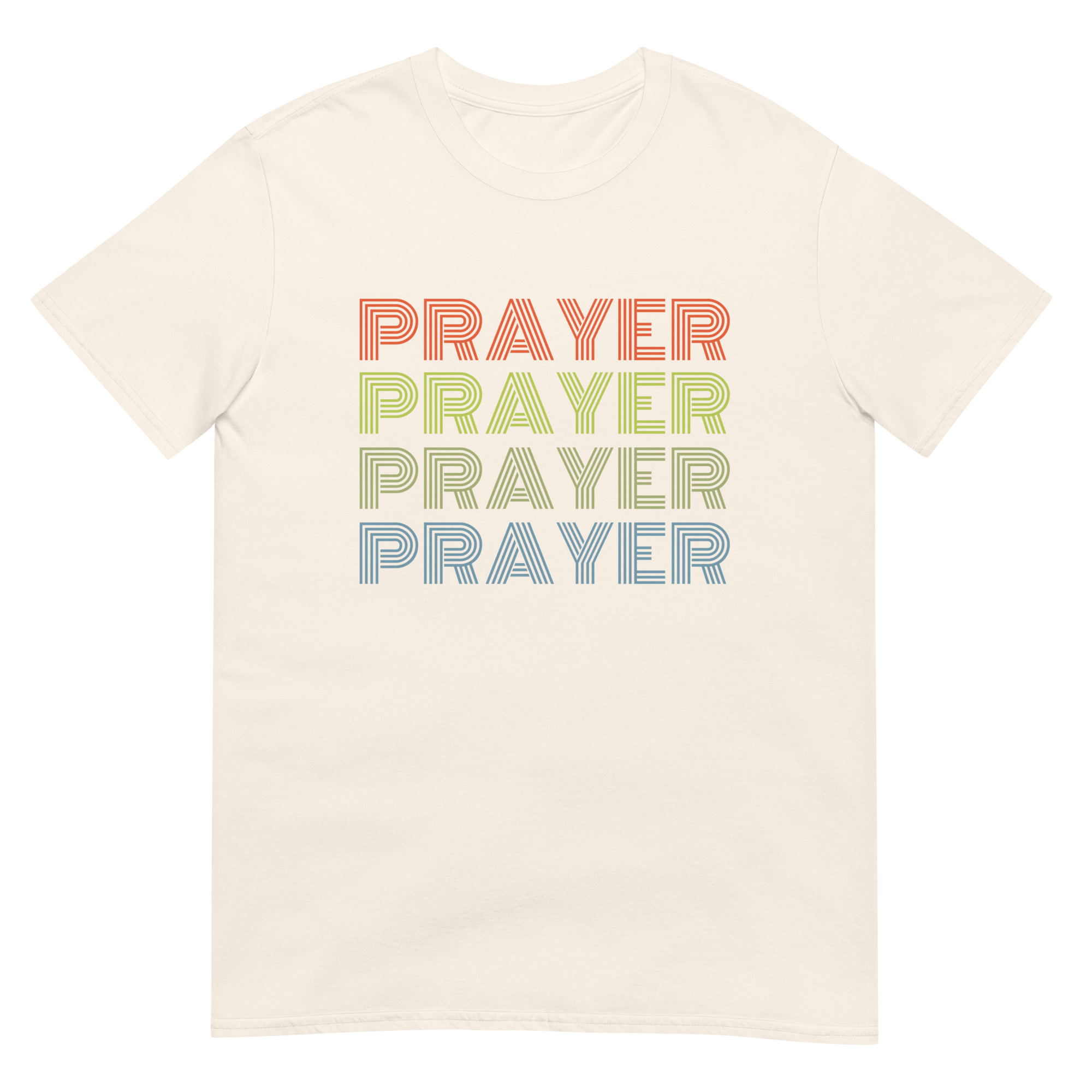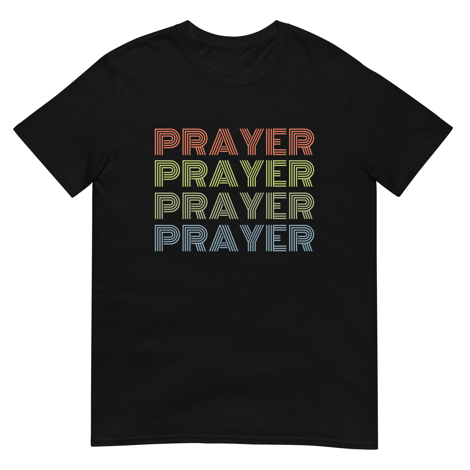 Bring faith and vintage vibes together with this Prayer, Prayer, Prayer, Prayer Christian t-shirt. Designed in a bold 80s-inspired retro font in vibrant colors. This Christian tee combines vintage design with spiritual encouragement, making it perfect for prayer groups, church events, or casual wear. Made with premium Gildan 64000 cotton, this shirt is soft, durable, and comfortable for everyday wear. Perfect for church, prayer groups, or as a unique Christian gift with a nostalgic twist.
